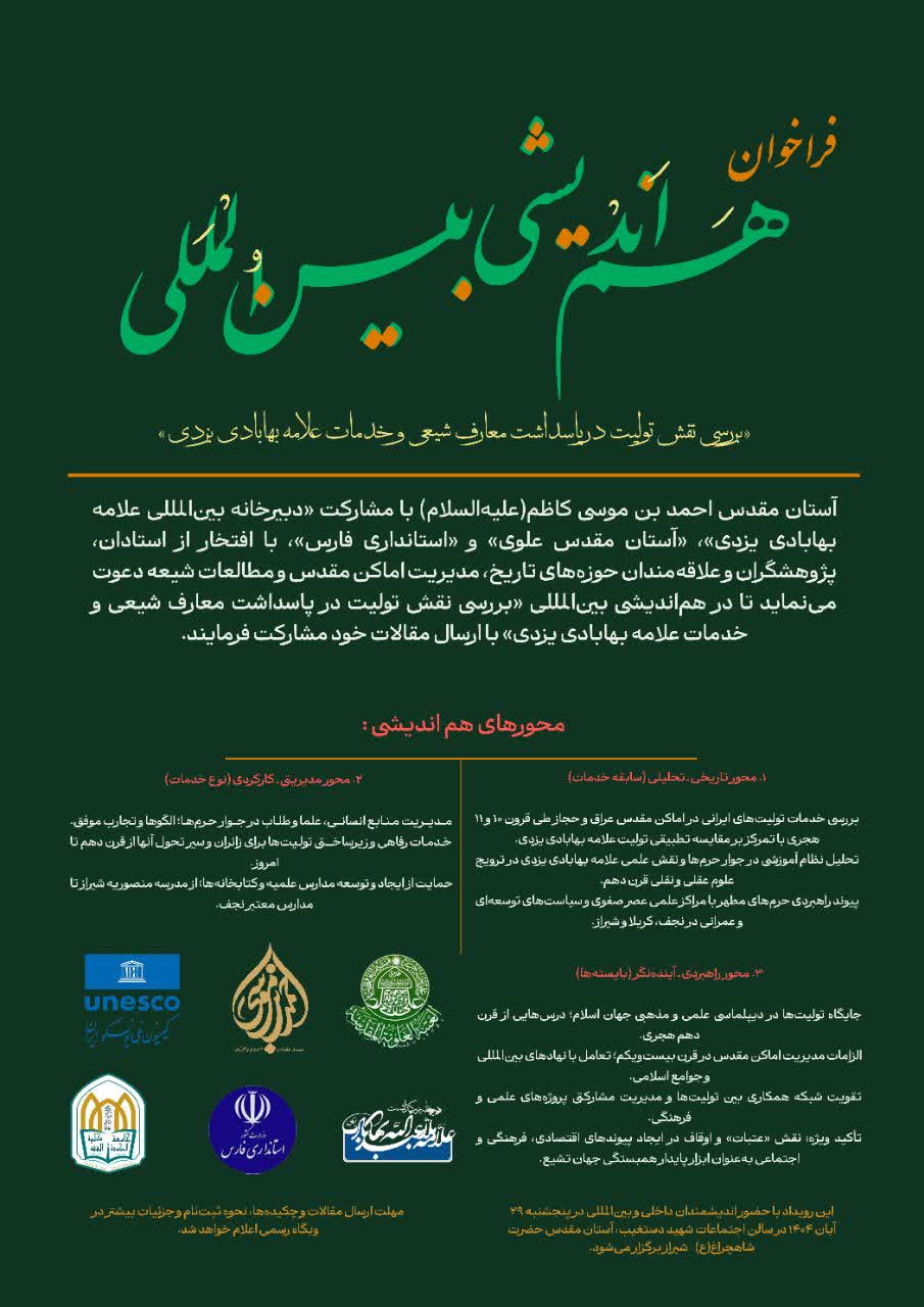 آستان مقدس حضرت احمدبن موسی کاظم (علیهماالسلام) با مشارکت دبیرخانه بین المللی علامه بهابادی یزدی، آستان مقدس علوی و استانداری فارس، با افتخار از استادان، پژوهشگران و علاقهمندان حوزههای تاریخ، مدیریت اماکن مقدس و مطالعات شیعه دعوت مینماید تا در هماندیشی بین المللی «بررسی نقش تولیت در پاسداشت معارف شیعی و خدمات علامه بهابادی یزدی» با ارسال مقالات خود مشارکت فرمایند.