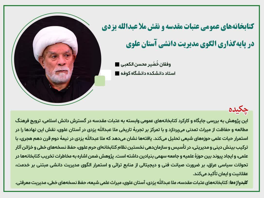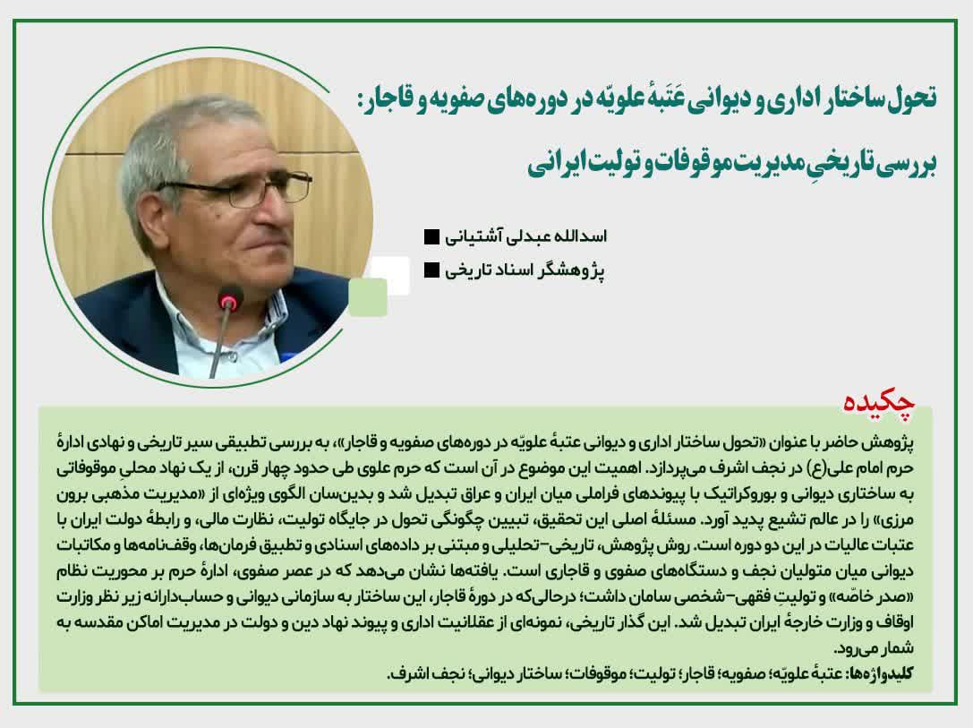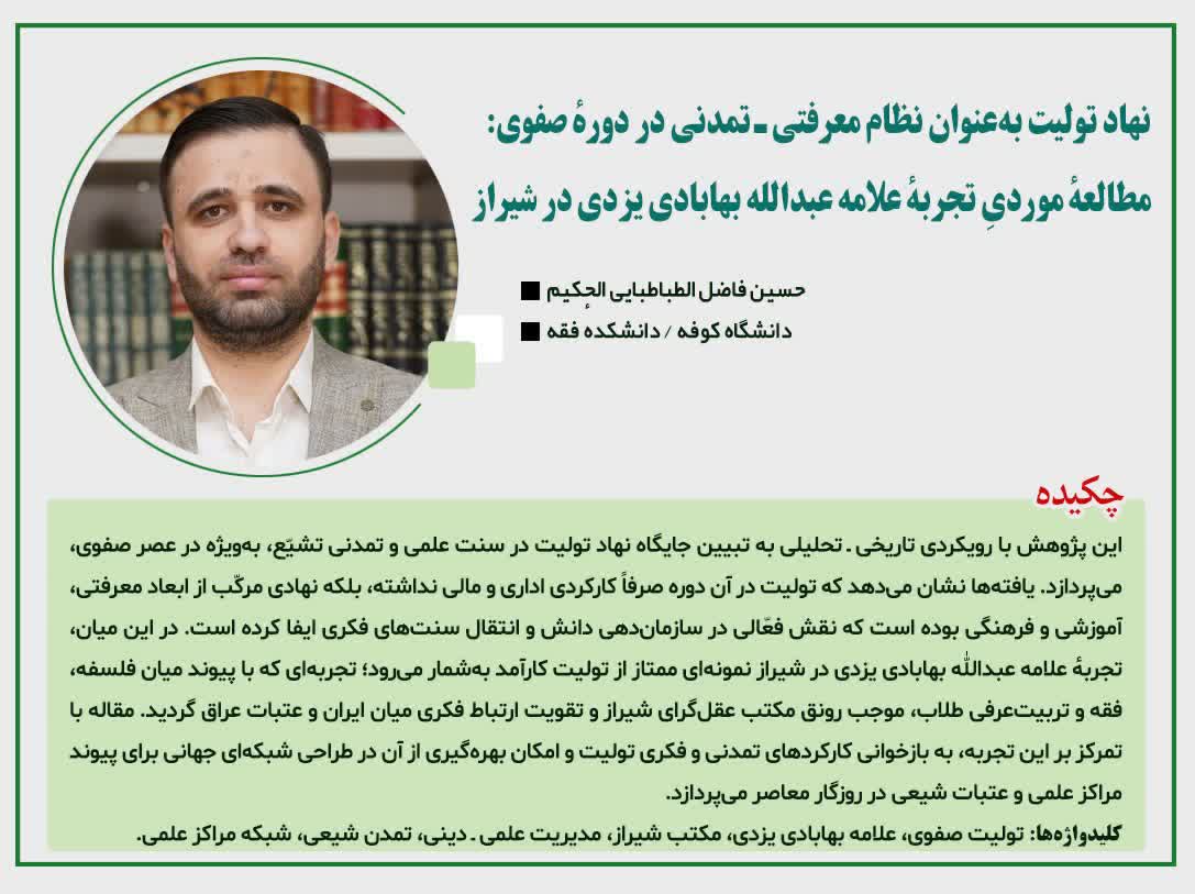▫️بررسی خدمات تولیتهای ایرانی در اماکن مقدس عراق و حجاز طی قرون ۱۰ و ۱۱ هجری، با تمرکز بر مقایسه تطبیقی تولیت علامه بهابادی یزدی.