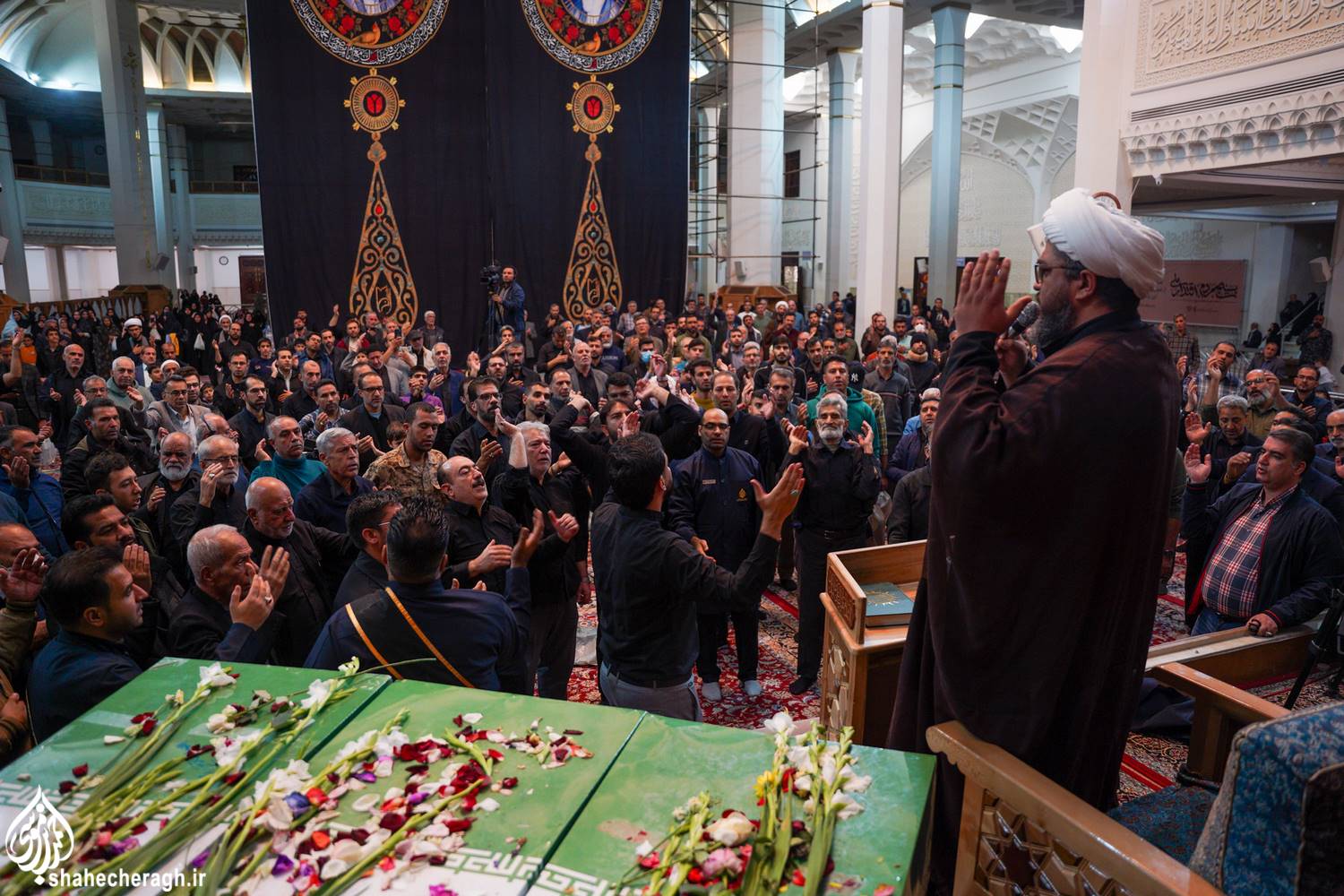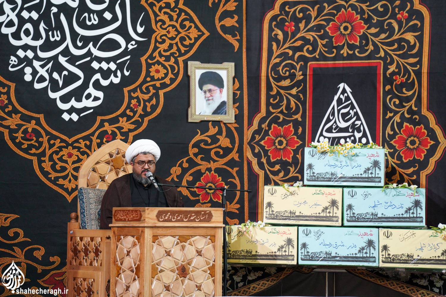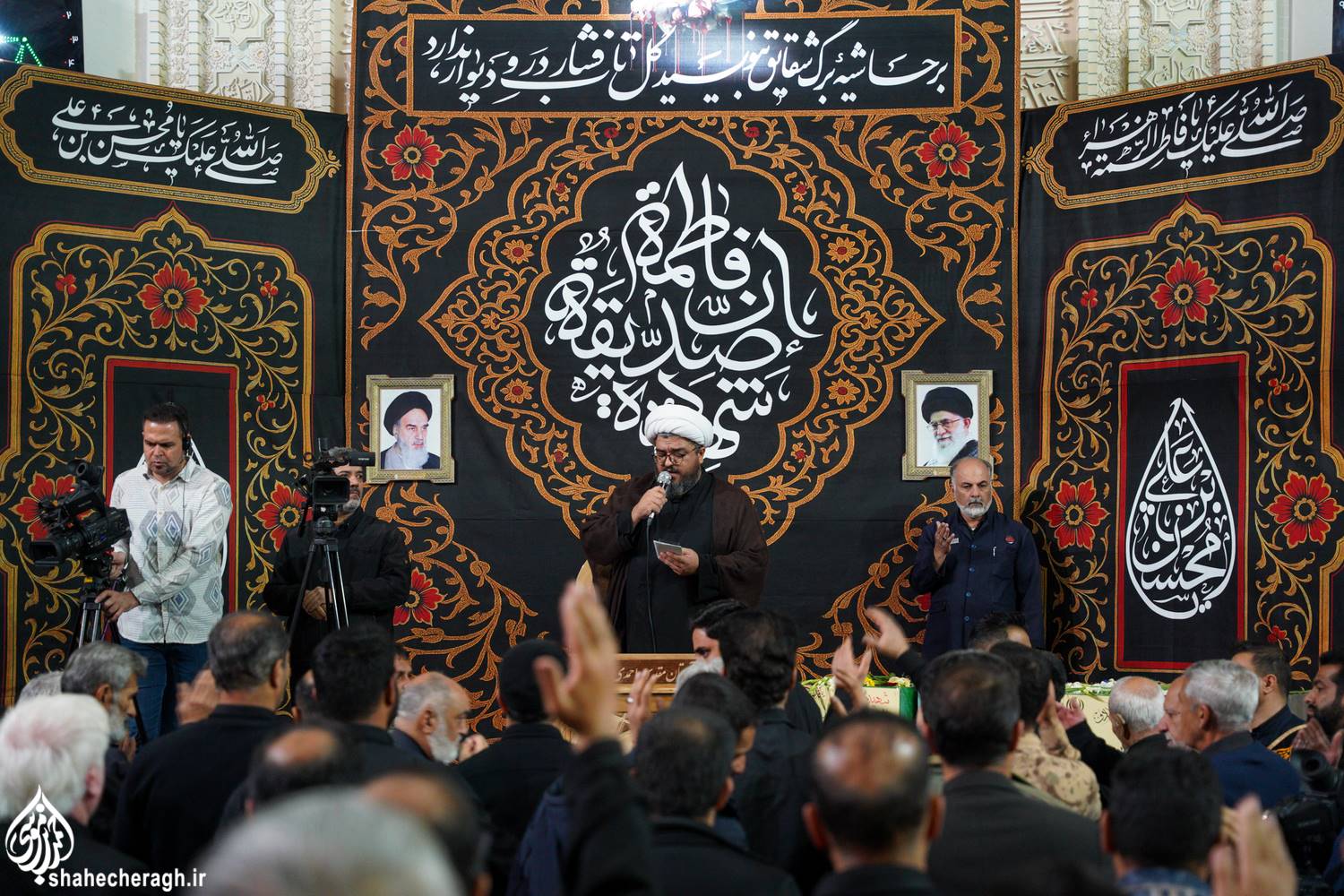 مراسم عزاداری شب شهادت حضرت فاطمةالزهرا علیهاالسلام، در حرم مطهر حضرت احمدبن موسی الکاظم علیهماالسلام/ آیین وداع با پیکرهای مطهر شش شهید گمنام دوران دفاع مقدس